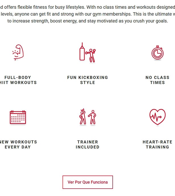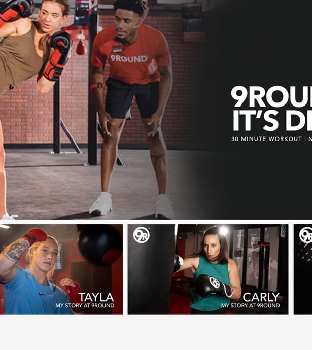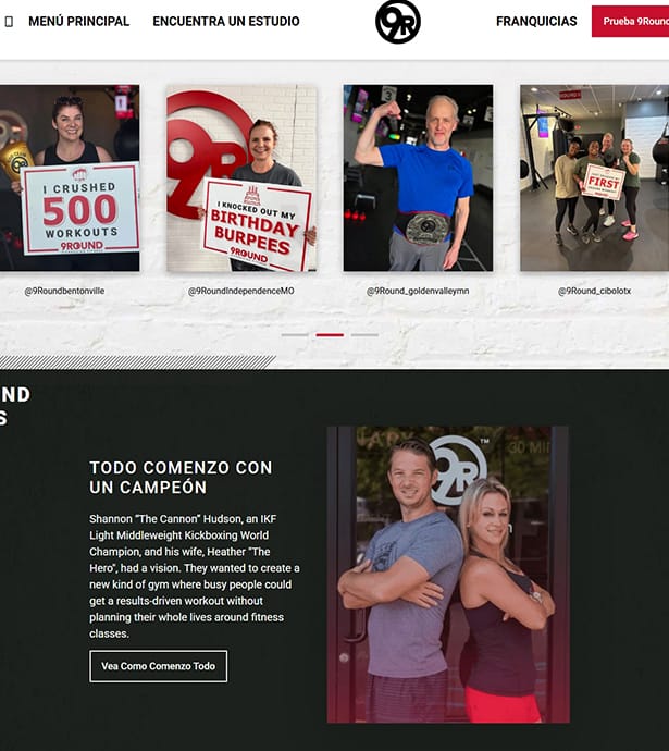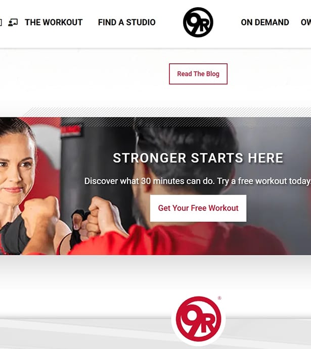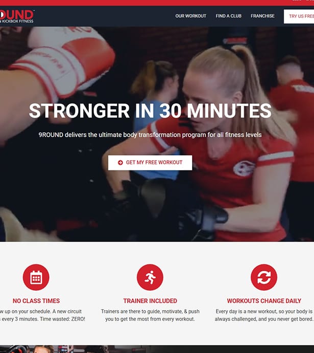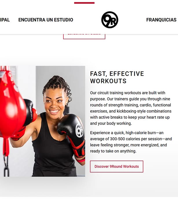 El sitio web oficial de 9Round refleja esta filosofía con un diseño directo, moderno y funcional: comunica desde la portada el beneficio principal (“Get stronger in just 30 minutes”), incluye un CTA inmediato (Try a free workout), y muestra fotografías reales de entrenamientos que transmiten energía, cercanía y comunidad. Su estructura sencilla permite acceder fácilmente a información clave como entrenamientos, ubicaciones, membresías y oportunidades de franquicia.