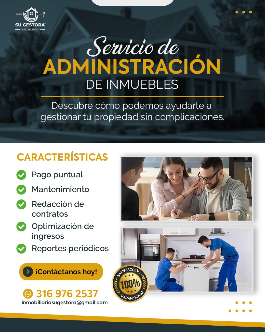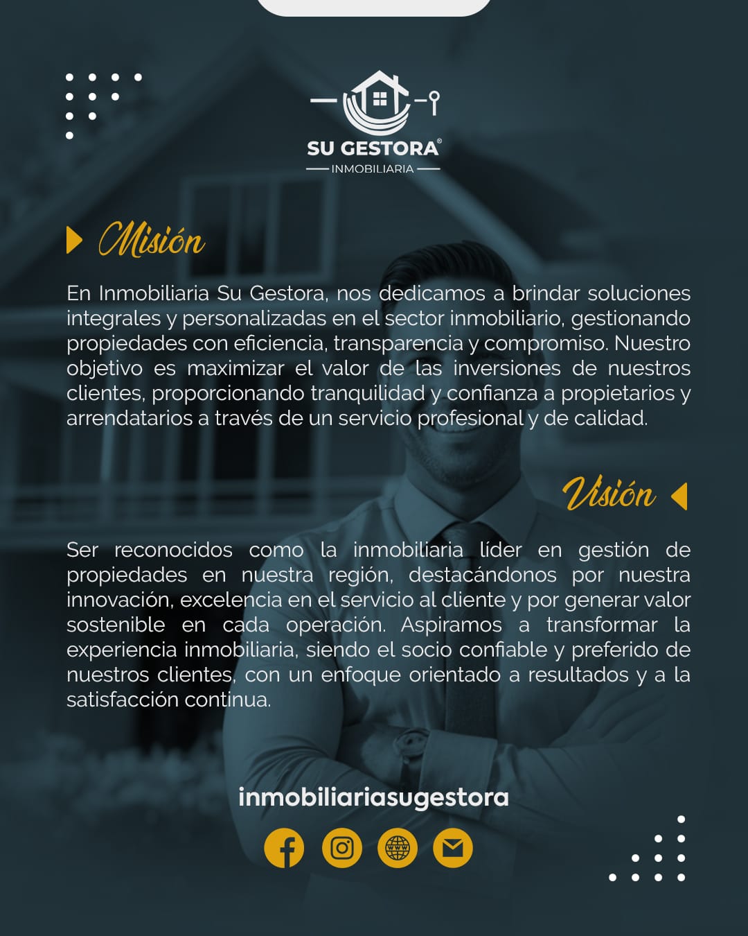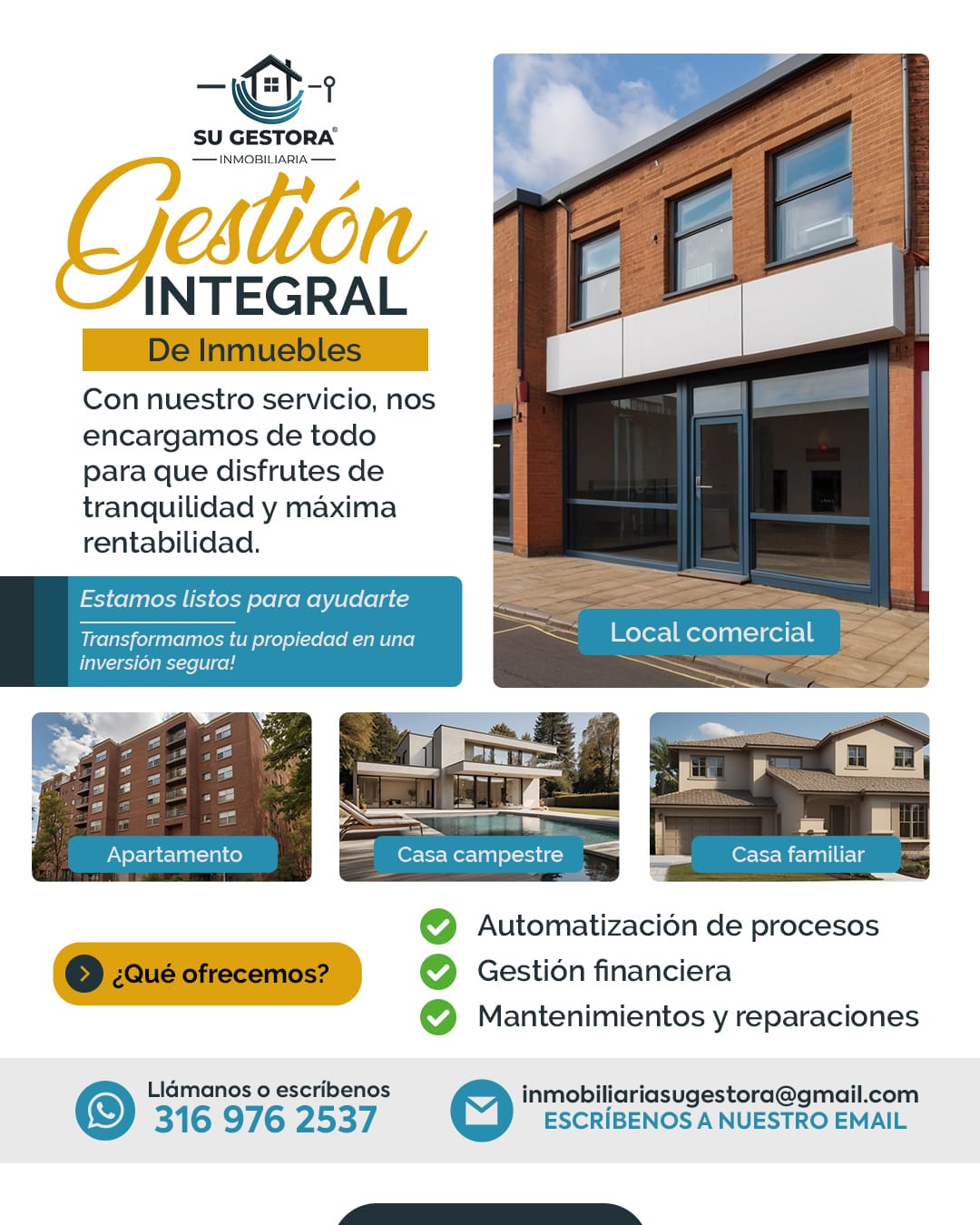 “Inmobiliaria Su Gestora” es una agencia que gestiona arrendamientos y ventas de inmuebles de forma totalmente virtual. Su propuesta se basa en generar rentabilidad a los propietarios mediante un modelo digital confiable, serio y automatizado.